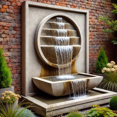 These fountains are mounted on walls, making them ideal for smaller spaces or as a focal point on a patio or garden wall. Water flows down a flat surface into a basin below.